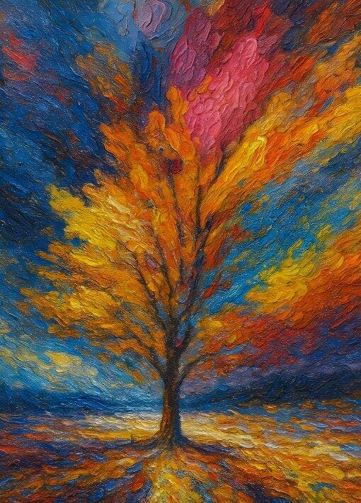 This piece features a solitary tree with fiery orange, gold, and crimson branches, bursting into a swirling dance of color. Rich blues, warm yellows, and deep reds blend together, creating a dramatic and inspiring composition that symbolizes vitality and growth.
